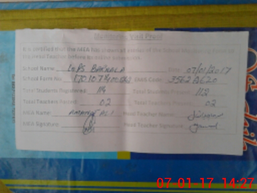 | Attendance Register | Head Teacher | MEA with School | Visit Proof |