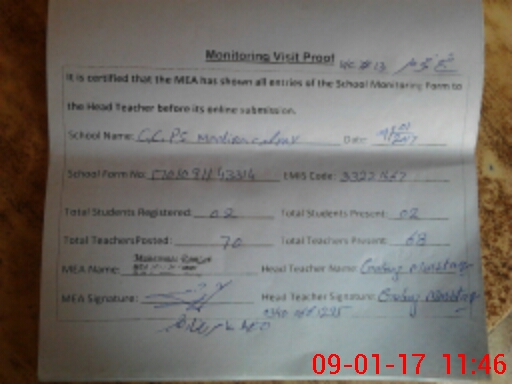 | Attendance Register | Head Teacher | MEA with School | Visit Proof |