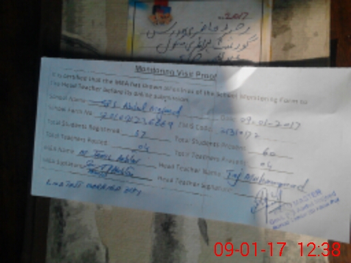 | School Visited by School Health & Nutrition Supervisor (No. of Visits) | 1 | Name1: | Samee Ullah | Name2: | Nil |