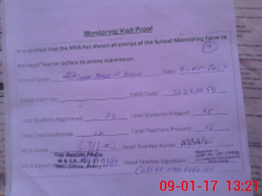| Name: AZ**** FA**** Designation: (School Headmaster's/Headmistress's) PST/PTC/JV Phone/Cell Number: 03**** |