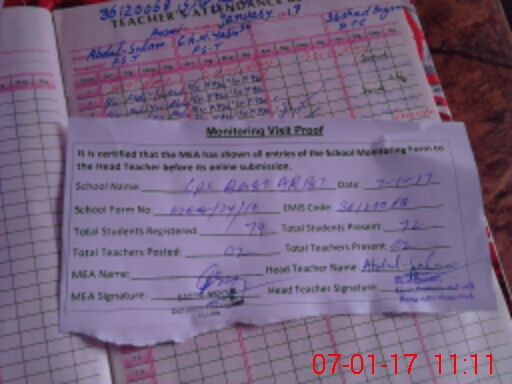 | Attendance Register | Head Teacher | MEA with School | Visit Proof |