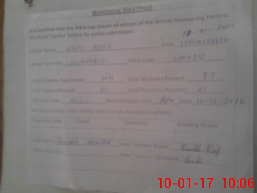 | School Visited by School Health & Nutrition Supervisor (No. of Visits) | 1 | Name1: | MOSHN FIAZ | Name2: | |