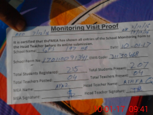 | Attendance Register | Head Teacher | MEA with School | Visit Proof |