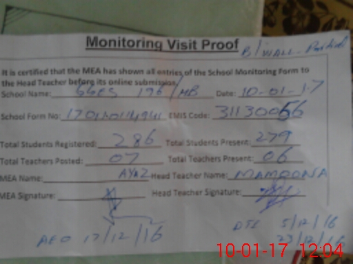 | Attendance Register | Head Teacher | MEA with School | Visit Proof |
