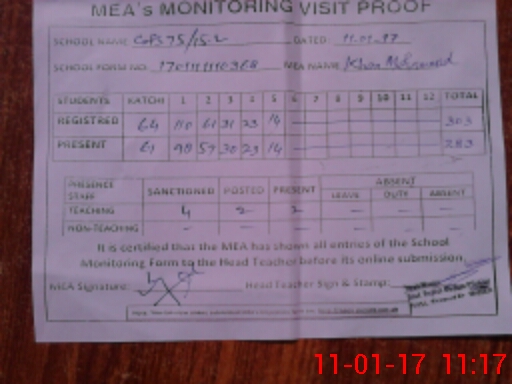 | Attendance Register | Head Teacher | MEA with School | Visit Proof |