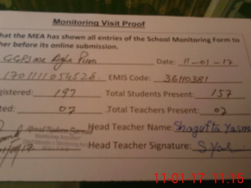 | Attendance Register | Head Teacher | MEA with School | Visit Proof |