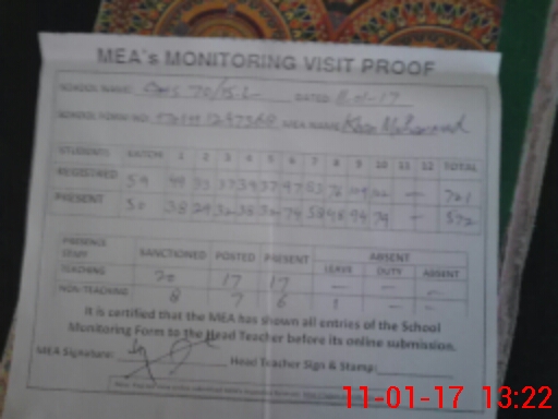 | Attendance Register | Head Teacher | MEA with School | Visit Proof |