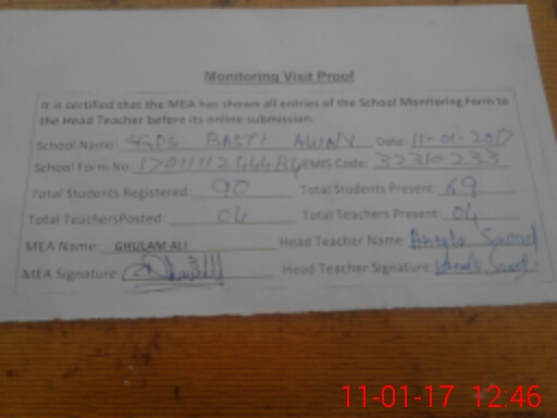 | EMIS Code: 32310233 | Name of School: GGPS BASTI AWAN | |||