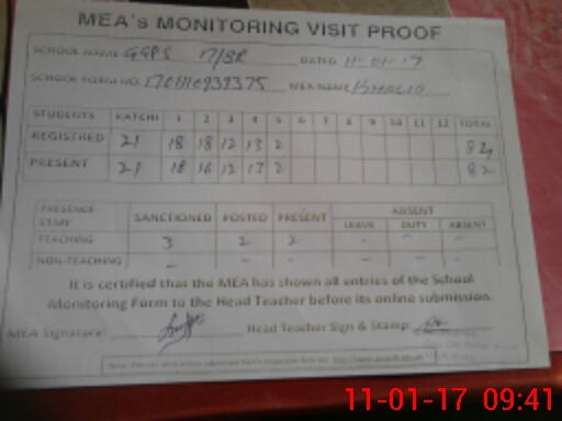 | Attendance Register | Head Teacher | MEA with School | Visit Proof |