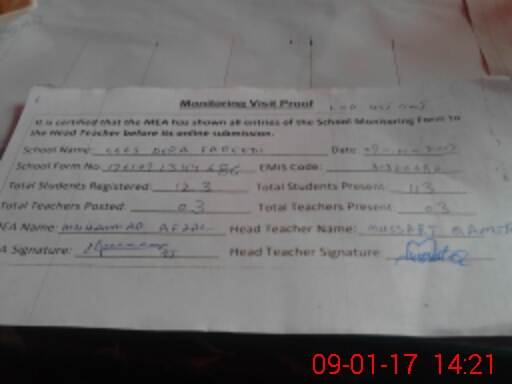 | Attendance Register | Head Teacher | MEA with School | Visit Proof |
