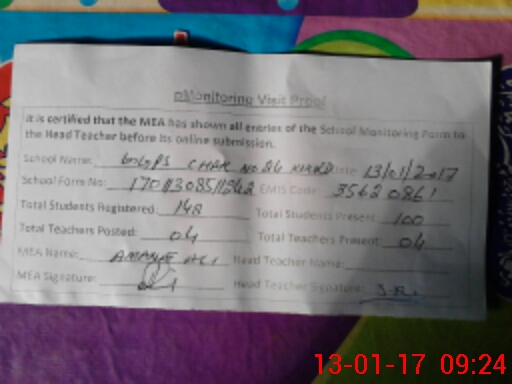 | Attendance Register | Head Teacher | MEA with School | Visit Proof |