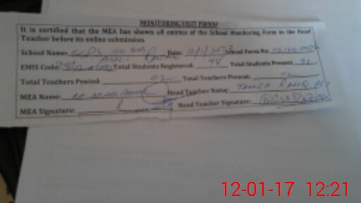 | Attendance Register | Head Teacher | MEA with School | Visit Proof |