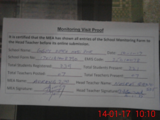 | Attendance Register | Head Teacher | MEA with School | Visit Proof |