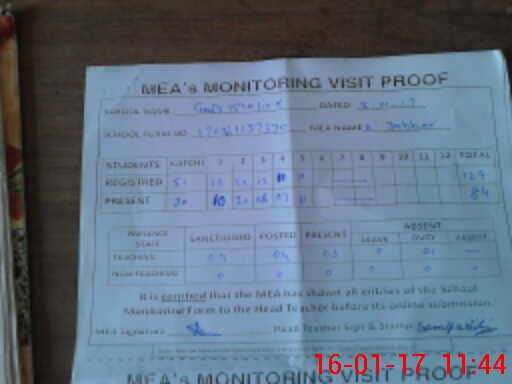 | Attendance Register | Head Teacher | MEA with School | Visit Proof |