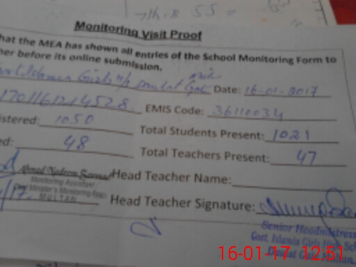| EMIS Code: 36110034 | Name of School: GGHS ISLAMIA DOULAT GATE MULTAN | |||