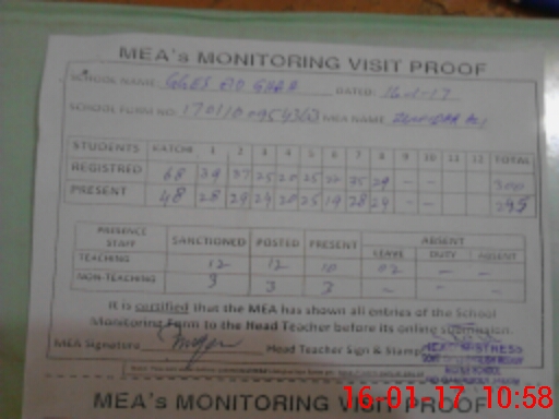 | Attendance Register | Head Teacher | MEA with School | Visit Proof |