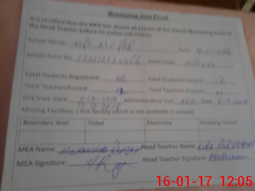 | Attendance Register | Head Teacher | MEA with School | Visit Proof |