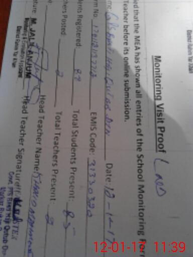 | Attendance Register | Head Teacher | MEA with School | Visit Proof |
