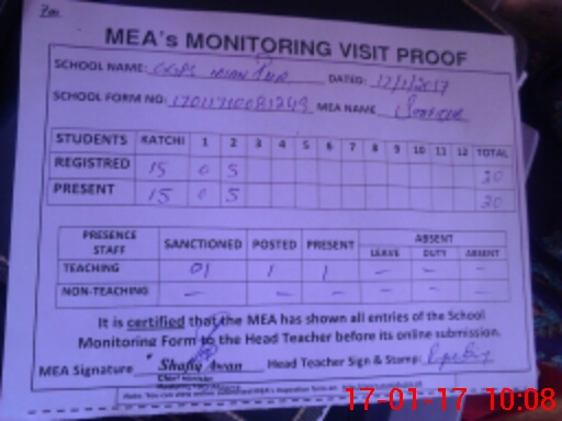 | Attendance Register | Head Teacher | MEA with School | Visit Proof |
