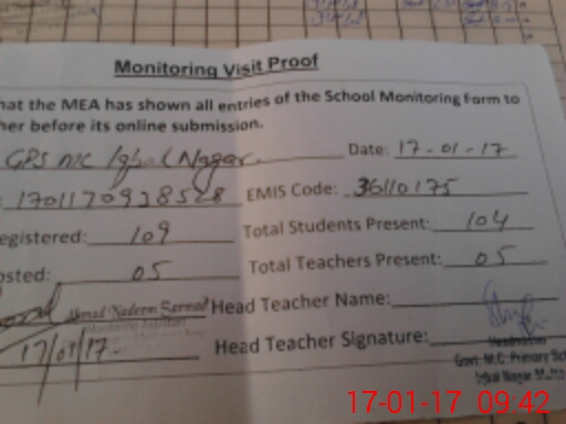 | Attendance Register | Head Teacher | MEA with School | Visit Proof |