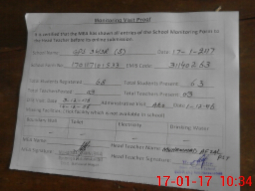 | School Visited by School Health & Nutrition Supervisor (No. of Visits) | 1 | Name1: | Zubair Ghani | Name2: | |