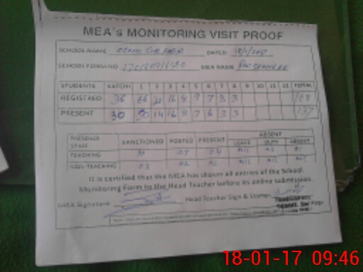 | Attendance Register | Head Teacher | MEA with School | Visit Proof |