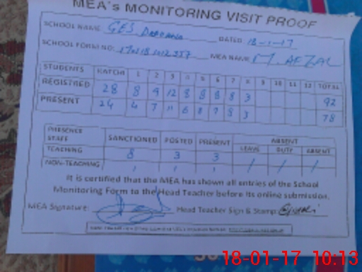 | Attendance Register | Head Teacher | MEA with School | Visit Proof |