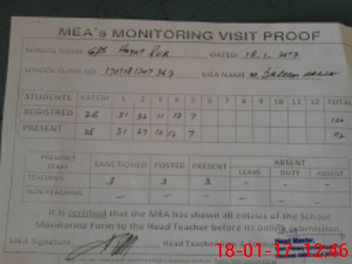 | Attendance Register | Head Teacher | MEA with School | Visit Proof |