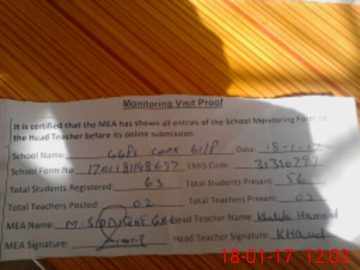 | Attendance Register | Head Teacher | MEA with School | Visit Proof |