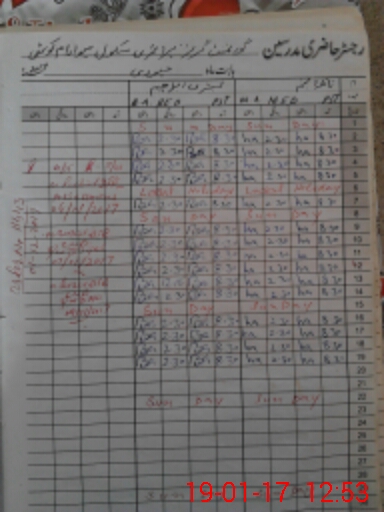 | CNIC | Full Name | Designation | R/C | Absence During Last Calender Month |