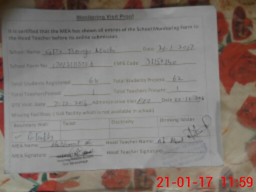 | Attendance Register | Head Teacher | MEA with School | Visit Proof |