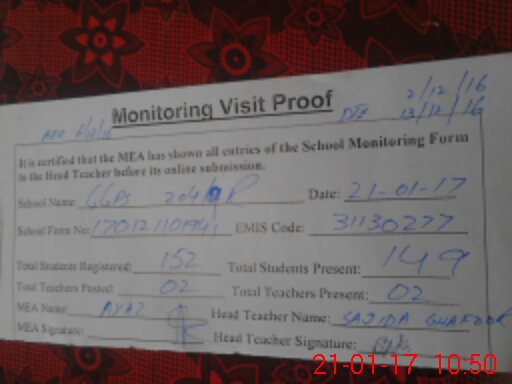 | Attendance Register | Head Teacher | MEA with School | Visit Proof |