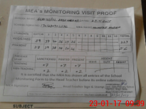 | Attendance Register | Head Teacher | MEA with School | Visit Proof |