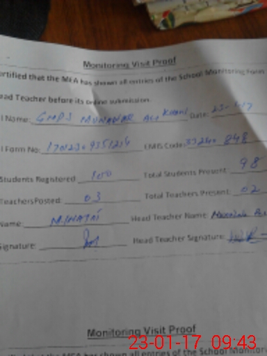| Attendance Register | Head Teacher | MEA with School | Visit Proof |