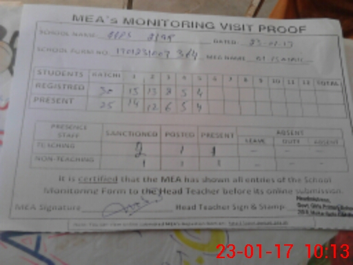 | Attendance Register | Head Teacher | MEA with School | Visit Proof |