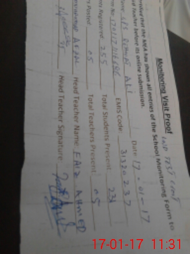 | School Visited by School Health & Nutrition Supervisor (No. of Visits) | 1 | Name1: | M Tahir | Name2: | |