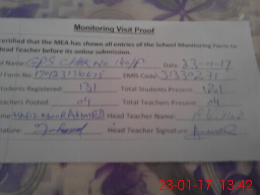 | Attendance Register | Head Teacher | MEA with School | Visit Proof |
