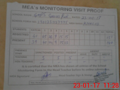 | Attendance Register | Head Teacher | MEA with School | Visit Proof |