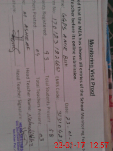 | Attendance Register | Head Teacher | MEA with School | Visit Proof |