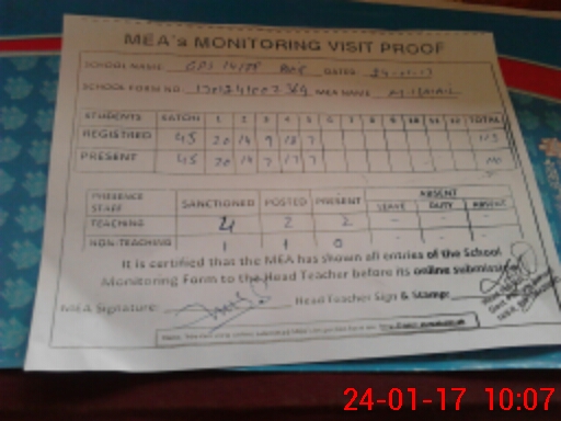 | Attendance Register | Head Teacher | MEA with School | Visit Proof |