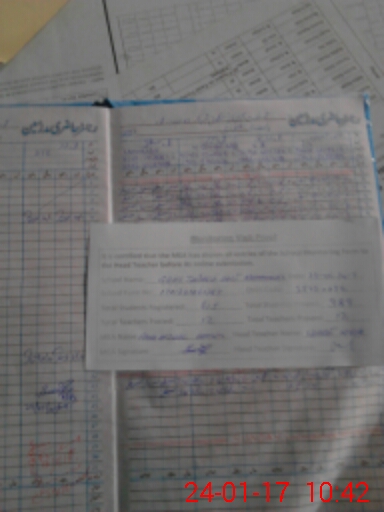 | Total no. of Classrooms: 10 No. of Classrooms Used for Teaching: 10 No. of Classrooms Storing Old Furniture, FTBs, etc: 0Comments if Any: START DATA ENTER BUT AFTER HALF AN HOURS ALL THE DATA WASHED DUE TO PMIU STOPED SO AGAIN ALL THE DATA REENTER REQUIRED MORE CLASS ROOMS ADMINISTRATOR VISIT NOT MADE BY THE DEO EDO IN THE MONTH OF DECEMBER 2016 |