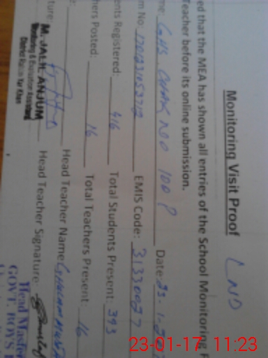| EMIS Code: 31330027 | Name of School: GHS CHAK NO. 100/P | |||