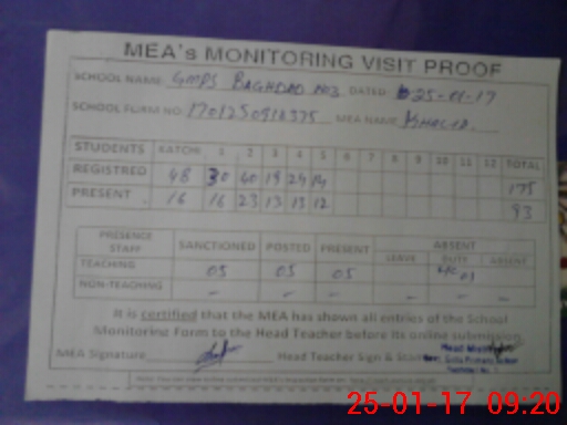 | Attendance Register | Head Teacher | MEA with School | Visit Proof |