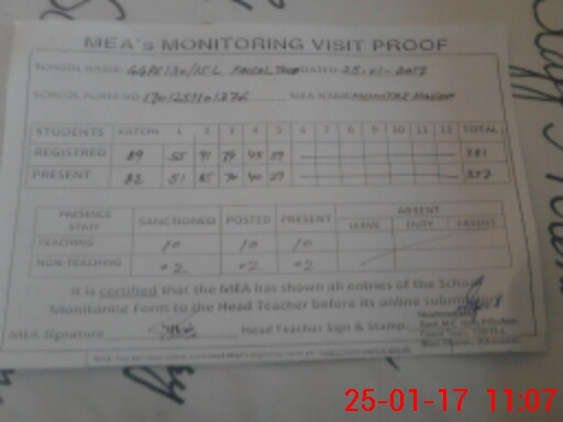 | Attendance Register | Head Teacher | MEA with School | Visit Proof |