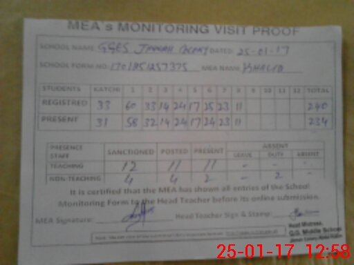 | Attendance Register | Head Teacher | MEA with School | Visit Proof |