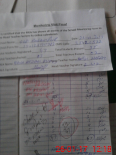 | Total no. of Classrooms: 2 No. of Classrooms Used for Teaching: 2 No. of Classrooms Storing Old Furniture, FTBs, etc: 0Comments if Any: Attendance register not available in the school DYDEO MURIDKE visited the SCHOOL on 26012017and attendance register of staff take with and TEACHER NARGIS PERVEEN PST AN ABSENT FROM SCHOOL ADMINISTRATOR AND DTE VISIT NOT ENTER BECAUSE ATTENDANCE regist |