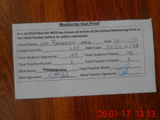 | EMIS Code: 32320148 | Name of School: GPS RAHMOON WALI | |||