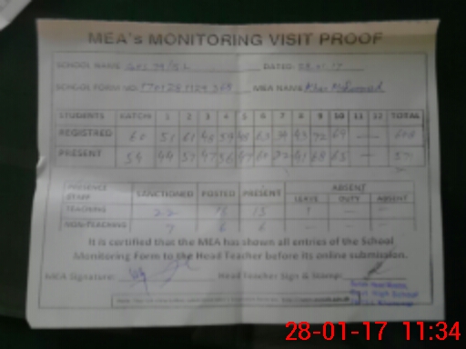 | Attendance Register | Head Teacher | MEA with School | Visit Proof |