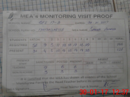 | Attendance Register | Head Teacher | MEA with School | Visit Proof |