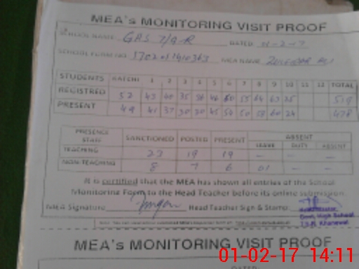 | Attendance Register | Head Teacher | MEA with School | Visit Proof |